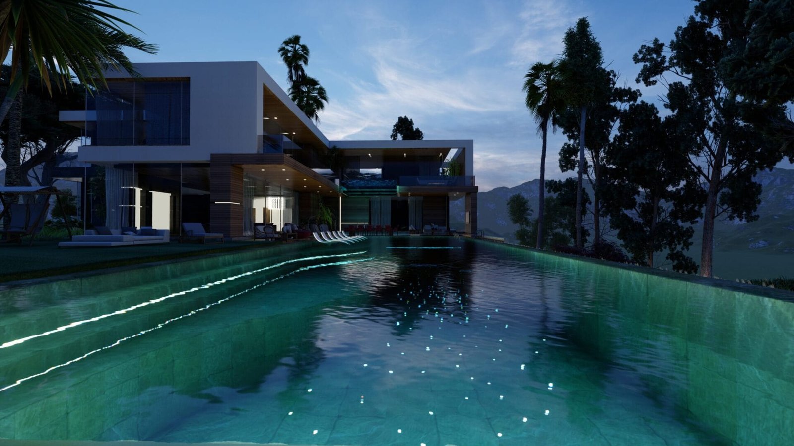 - Aménagements extérieurs comprenant une piscine à débordement, un jardin paysager et une terrasse ensoleillée.